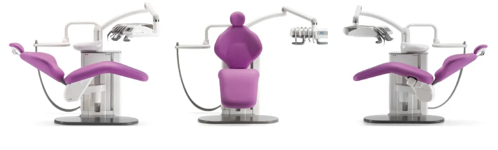 Sütun Su Ünitesi ve Askıya Alınmış Hasta Koltuğu ile Diş Ünitesi Simetrik DOUBLE FACE yapısı, koltuğu pnömatik rotasyonla döndürerek üniteyi sağdan sola pozisyona dönüştürmenize izin veren bir sistemdir